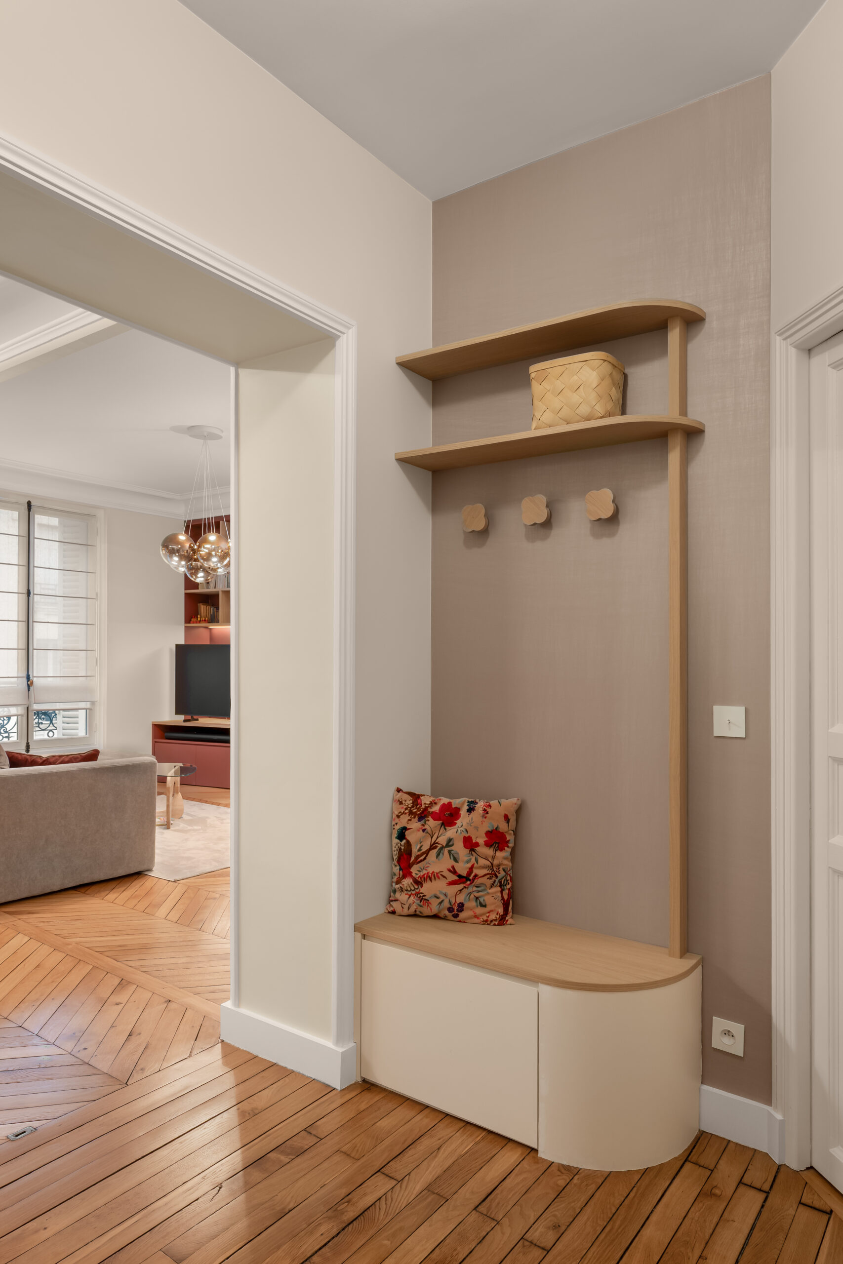 Ce couple avait déjà rénové son appartement, il y a quelques années et souhaitait une rénovation complète plus qualitative, avec des espaces plus doux et harmonieux, ponctués de mobilier sur-mesure.